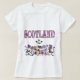 The design on this Scottish-themed t shirt features the word Scotland in a tartan check above a border of coloured thistles, the flower of Scotland.