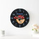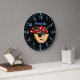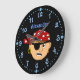 This fun custom wall clock is perfect for your favourite pirate boy. It has a boy pirate in the centre. He's wearing an eye patch, and a pirate red bandanna.