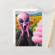 A screaming pink alien is offered cotton candy in a sunflower field a faux Van Gogh AI generated art