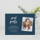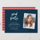 Stylish photo graduation party invitation featuring your photo in a white border and "Grad Party" in trendy script against a blue background on the front and a red and white stripes pattern back side.