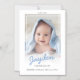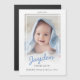 Modern birth announcement template magnetic card for baby boys. Add your own photo on the front of the card in the stylish faded white frame. Your child's first name can be added in blue script font. The child's middle and last name and birth stats follow. Simple and elegant design.