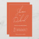 Modern and whimiscal white script calligraphy Verona sunset orange minimalist fall wedding Invitation. This design features a vibrant sunset orange background, offering a warm and inviting foundation for the exquisite white script calligraphy. The couple's names, elegantly showcased in this flowing typeface, add a personal touch of artistry and romance, crafting a memorable first impression for your guests. A solid orange reverse side completes the clean and cohesive aesthetic, ensuring your invitation truly announces a celebration of grace and love.