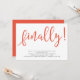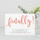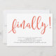 A fun engagement party invitation featuring the word "finally!" in bold hand lettered font and party details in modern sans serif font. The text (including the word 'finally') and background colours can be edited by clicking 'customise further'