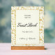 Floral guest book sign with sript font in cream and gold tones with a floral frame