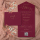 All in one burgundy and gold wedding invitation featuring elegant hearts script typography and monogram initials. The invitation includes a perforated RSVP card with your personalised wedding QR code. Designed by Thisisnotme©