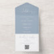 All in one dusty blue wedding invitation featuring elegant hearts script typography and monogram initials. The invitation includes a perforated RSVP card with your personalised wedding QR code. Designed by Thisisnotme©