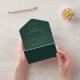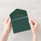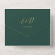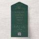 All in one emerald green and gold wedding invitation featuring elegant hearts script typography and monogram initials. The invitation includes a perforated RSVP card with your personalised wedding QR code. Designed by Thisisnotme©