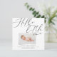Hello little one modern 1 photo birth announcement. Elegant wonder script typography design text, modern printed photo effect. Black white monochrome polka bot backer design.