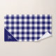 Stylish custom towel set features a handsome navy blue and white buffalo plaid with a white script monogram in a dark blue triangle in the lower right corner of each piece. Customise it with your initial in the sidebar. Navy, white, and light blue squares form a bold checked pattern. Buy the full set or any piece of it.