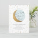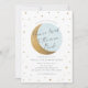 A pretty, baby shower invitation featuring gold star frame and moon with soft pastel watercolor shadow on a clean white background.