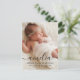 This elegant birth announcement postcard features modern calligraphy and a large photo. Your newborn's first name is written in pretty black calligraphy across the bottom of the card. Below, you can add your baby's full name, birth date, and birth stats. On the back of the postcard, you'll find space to write a longer custom message to recipients.
