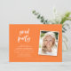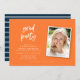Stylish photo graduation party invitation featuring your photo in a white border and "Grad Party" in trendy script against an orange background on the front and a blue and white stripes pattern back side.