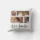 Pillow featuring the words "Our Family" in a stylish script with 4 photos photos arranged side by side on the front and back side making it 8 photos in total that you can replace with you own photos against a white background. You can also add your family name and the year established. Perfect for home decor, newlyweds, family keepsakes, etc.