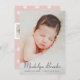 Announce your new baby girl to family and friends in style with this simply chic photo birth announcement. Features an elegant charcoal grey (can be customised) text overlay on the front featured photo, and three square photos on the back of the card with text that can be personalised. Background on the back side includes a pink and white polka dot pattern with a textured appearance. Use the "customise it" feature to edit the text colours and position.