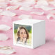 Modern graduation party thank you favour boxes featuring two photos of the graduate overlayed with "thank you" in an elegant script and their name and class year in simple typography.