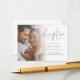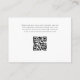 Script Photo QR Code Reception Details Enclosure. Replace the sample photo with your own favorite. A gradient overlay layer is on top of your image so it fades out as it reaches the center with the text partially overlaid on top. Reception is in a modern set script and easily personalize the rest of the text. Replace the QR code on the back with the QR code to your wedding website. You can create QR codes for free online. Simply search “QR code creator” and lots of options come up to create for free. You can also delete the QR code and text on the back if not required via customize further.
