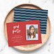 Stylish photo graduation party invitation featuring your photo in a white border and "Grad Party" in trendy script against a red background on the front and a blue and white stripes pattern back side.