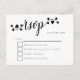 A convenient way for your guests to RSVP to your invitations is by postcard with your address details already there so they can just complete the front and pop it back in the post to you. This elegant design has RSVP in lowercase script with swashes on the first and last letter with 6 heart shape leaves each end. The rest of the text is easily personalised including your return name and address details on the reverse.