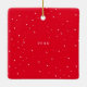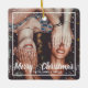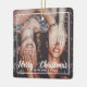 Minimalist Bright Red Photo Snowflakes Christmas keepsake Tree Ceramic Ornament featuring your personalised photo into a modern and stylish snowfall white frame, the script text Merry Christmas with heart calligraphy swashes, custom names and year.