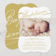 This modern religious invitation flat card accommodates a single photo layout and features an elegant and classic calligraphy script with a simple rosary cross accent.