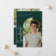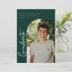 Modern scripted "graduate", arch frame photo graduation announcement/invitation. Features, white typography on forest green backgrounds.