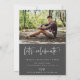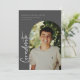 Modern scripted "graduate", arch frame photo graduation announcement/invitation. Features, white typography on dark grey backgrounds.