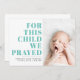 A typographical birth announcement perfect for a boy, featuring an adaptation of the Bible verse 1st Samuel 1:27 - "For this child I have prayed" in bold light light blue/teal font, with the birth details of your little boy in dark grey. On the right hand side, add your favourite photo of your baby. This announcement is perfect for a rainbow or miracle baby.