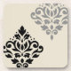 Scroll and leaf damask repeat design in black and grey detail on a cream colour background.