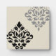 Scroll and leaf damask repeat design in black and grey detail on a cream colour background.