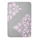 Scroll and leaf damask in a vintage style design, with light pink detail on a grey background.