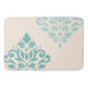 Scroll and leaf damask repeat design in light and mid-teal detail on a cream colour background.
