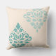 Scroll and leaf damask repeat design in light and mid-teal detail on a cream colour background.