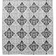 Decorative scroll and leaf damask surface pattern design in black and grey detail on a white background.