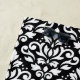 Decorative scroll and leaf damask surface pattern design in white detail on a black background.