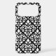 Scroll and leaf damask in a vintage style large pattern, with white detail on a black background.