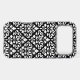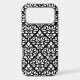 Scroll and leaf damask in a vintage style large pattern, with white detail on a black background.