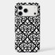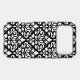 Scroll and leaf damask in a vintage style large pattern, with white detail on a black background.