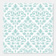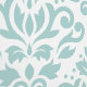 Scroll and leaf decorative damask surface pattern design in light teal colour detail on a white background.