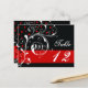 Elegant floral scroll leaf black, red flourish wedding table number postcard, featuring white scroll leafs, swirls and curls and red dots on black background. There is a red band with your text to the bottom. Classy, stylish and chic design perfect for a winter wedding.
