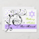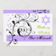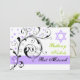 Elegant floral scroll leaf black, white, purple flourish and Star of David Bat Mitzvah (בת מצוה) invitation, featuring white scroll leafs, swirls, curls and purple dots on white background. There is a lavender purple band with the text Bat Mitzvah to the bottom. Classy, modern, stylish and chic design perfect for your event. Name written in lime green.