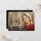 Swirly script overlay with automatic shading on top of your grad photo, full-size cover photo with white elegant swirly script text with "the graduate", special effect frame shadows and darkens to reveal a fashionable invite for friends and family