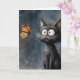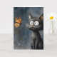A curious, scruffy black cat gazes intently at a vibrant monarch butterfly against a backdrop of dark and muted colors of an alley.