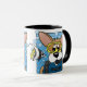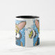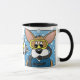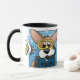 Fun and brightly coloured Pembroke Welsh Corgi cartoon of the dog breed scuba diving, regulator in mouth, and a longfin bannerfish swimming by curiously. The background has lots of bubbles! Unique corgi mug for scuba divers and dog lovers.