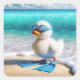 A fluffy white duckling stands on a sandy beach, wearing blue flippers and diving goggles
