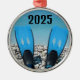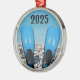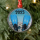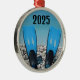 The image pair of scuba diving fins stand up on a rocky beach against a blue sky and ocean makes this ornament a unique and fun gift for all scuba divers, The year may be changed easily or removed.