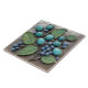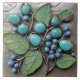 Sculptured Blueberry mosaic ceramic tile features a beautiful arrangement of sculptured blueberries and intricate green sculptured leaves, some turquoise stones were added set against a backdrop of shimmering silver back drop. The intricate details and vintage-inspired design create a timeless piece of art that will add elegance to any space.