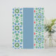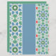 Decorative tiles with geometric patterns in shades of blue and green are showcased, separated by a solid light blue vertical stripe. The patterns on the tiles include star and diamond shapes surrounded by dots, lending a mosaic-like quality to the overall design.