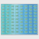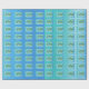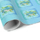 This wrapping paper fades from blue green to deeper blue with a repeated image of a frame with a seahorse looking dragon wrapped in green seaweed with water bubbles.