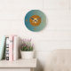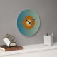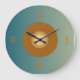 A simplistic round clock in sea green. At the centre is a circle design in light tan ,bronze and lemon . Numerals to match . Available in round and square shapes.Customise to change numerals colours if wished.