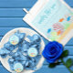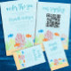 Sea life baby shower with orange and blue fish playing amongst a sandy reef of coral and seaweed, amidst ocean bubbles.